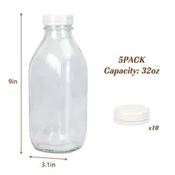 Show moreIntroducing the Moretoes 5pcs 32oz Glass Milk Bottles with Lids, your essential kitchen solution designed for storing and preserving your favorite beverages and condiments. Crafted from high-quality clear glass, these durable bottles not only enhance the aesthetic of your kitchen but also keep your drinks fresh and delicious. With a generous capacity of 32oz (1000ml) per bottle, they are perfect for storing milk, juice, milkshakes, jams, and so much more. Plus, they feature tamper-proof white caps that ensure your food is sealed and secure, making them ideal for everyday use or special occasions.