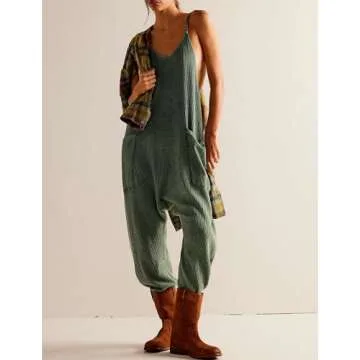 morhuduck Women's Sleeveless Jumpsuits Casual Waffle Knit Rompers V Neck Loose Overalls Spaghetti Strap One Piece Jumpsuits with Pockets,Green S