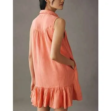 morhuduck Women's Summer Shirt Dress Causal Sleeveless Button Up Dress Ruffle Hem Dress with Pockets,Pink XS