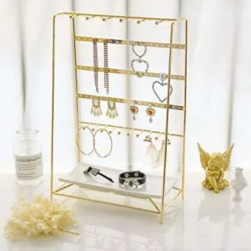 Show moreDiscover the stylish and functional MORIGEM Jewelry Stand Holder Organizer, an exquisite addition to any jewelry collection. Crafted with elegance, this multifaceted jewelry organizer features dual-height posts designed to accommodate all types of jewelry, from long necklaces to dainty chokers, bracelets, and bangles. Its beautiful gold finish is not only corrosion-resistant but also adds a touch of sophistication to your vanity or dresser. The integrated white ceramic tray lends additional storage, making it an ideal spot for your favorite accessories. Perfect for both storage and display, the MORIGEM Jewelry Stand ensures your treasures are always visible and easily accessible, encouraging you to wear your jewelry more often.