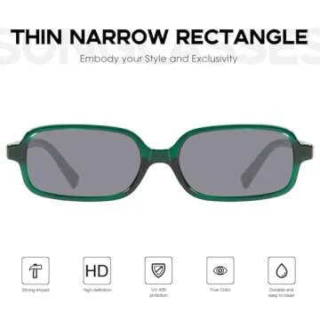 Show more Introducing the mosanana Retro 90s Rectangle Sunglasses, the perfect fusion of style and functionality for those who appreciate vintage aesthetics! These sunglasses feature an eye-catching small rectangular frame reminiscent of the vibrant 90s trends, guaranteed to elevate your fashionable vibe. Adorned with distinctive metal flakes on the temples, they embody a unique artistic flair that makes them a must-have accessory this season. Designed for the contemporary fashionista yearning to make a statement, you'll find these shades not only chic but also a true reflection of your personality.