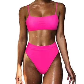 MOSHENGQI Women's High Wasited Shoulder Strap 2 Piece Cut String Swimsuit, 33 Hot Pink, Medium