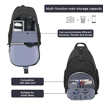 Show more Discover the ultimate companion for your photography adventures with this versatile camera sling bag, crafted for both functionality and style. Designed with dimensions of 15.7 x 10.2 x 5.9 inches, this bag boasts a thoughtful layout that includes multiple compartments for your camera, phone, tablet, and essential accessories. The main compartment features removable modular inserts, allowing you to customize the inner space according to your needs, ensuring that your gear remains organized and easily accessible.