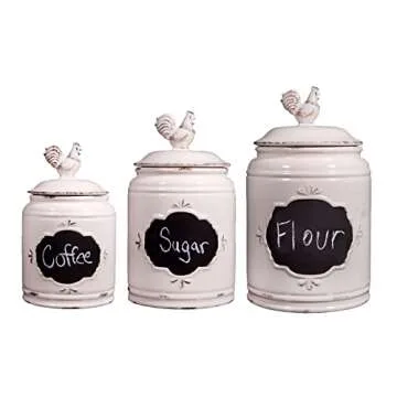 MosJos Kitchen Canisters Set of 3 Antique Jars for Kitchen Storage with Rooster Lid, Premium Ceramic Canister Set with Chalkboard Labels – Airtight Farmhouse Canisters for Flour, Coffee, Sugar.