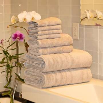 Show moreUnwind and indulge in the lavish comfort of the Mosobam Luxury Turkish Towel Set, expertly crafted to enhance your bathing experience. This exquisite 8-piece set includes two extra-large bath towels measuring 35"x70", two hand towels at 16"x30", and four face cloths perfect for any skincare routine. Made from a luxurious blend of 50% Viscose from Bamboo and 50% Aegean Turkish Combed Cotton, this towel set guarantees an ultra-soft touch along with exceptional absorbency, making it a perfect addition to your bathroom sanctuary.