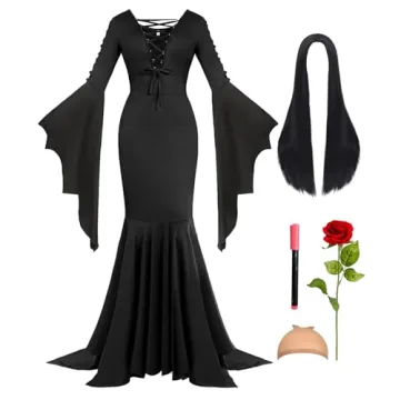 Show moreIntroducing our delightful Halloween Costume Set, an essential addition to your festive wardrobe this season. This complete package includes a stunning floor-length black goth dress, a lavish 27-inch batwing sleeve cape, a chic long black wig, a decorative red rose, and a nail polish pen. Every item has been thoughtfully curated to ensure you look magnificent as you celebrate the spookiest day of the year. Designed for comfort and style, this set features stretchy and forgiving fabric that molds to your shape, making it not only flattering but also easy to wear throughout the Halloween festivities. Whether you are channeling your inner witch, a gothic princess, or a classic character like Morticia Addams, the versatility of this costume allows for endless creative possibilities. The vibrant wig, while shiny, can be easily styled to your liking, and the included accessories serve to enhance your overall look. Perfect for parties, trick-or-treating, or themed events, this costume set makes preparing for Halloween a delightful experience.