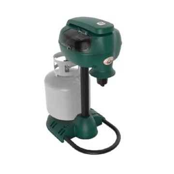 The Mosquito Magnet attracts biting insects using carbon dioxide, heat, and moisture from propane, trapping them in a vacuum net.