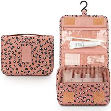 Mossio Hanging Toiletry Bag - Large Cosmetic Makeup Travel Organizer for Men & Women with Sturdy Hook (Pink Leopard)