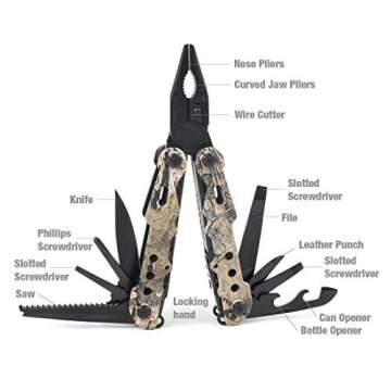 When compared to similar multi-tools on the market, the MOSSY OAK Multi-tool excels due to its superior durability and comprehensive set of functionalities. While many competitors offer similar tools, they often fall short in terms of build quality and ease of use. The unique locking mechanism found in this multi-tool enhances safety and functionality, ensuring that each tool operates effectively without the risk of accidental closures while in use, a common issue with competing brands.