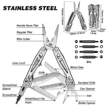 The multitool features an impressive array of functionalities, including needle nose pliers, wire cutters, and numerous screwdrivers, making it a versatile companion for any task. Its ergonomic grip ensures comfort during use, while the thoughtful inclusion of both serrated and plain blades provides flexibility based on your tasks need.