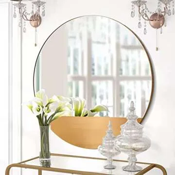 Show more Transform your living space with the exquisite MOTINI 32 Inch Round Decorative Wall Mirror. This stunning mirror is not just a functional item but an elegant piece of art that enhances any room's ambiance. Measuring an impressive 32.8 inches in diameter with a sleek 0.78 inches thickness, its luxurious brushed brass stainless steel frame adds a chic touch to your decor. This mirror is perfect for those seeking both style and utility, showcasing a modern design and flawless craftsmanship that seamlessly blends with contemporary and traditional interiors alike.