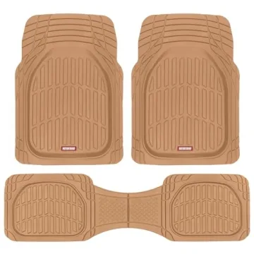 Show more Introducing the Motor Trend FlexTough Floor Mats - the ultimate all-weather solution designed to keep your car's interior spotless and stylish! These beige deep dish floor mats are crafted to provide maximum protection against snow, rain, and mud, ensuring that your vehicle remains clean no matter the conditions outside. Made with a proprietary heavy-duty rubber blend, each mat is both durable and resilient, maintaining its shape without deforming or cracking. The impressive universal fit means these mats mold effortlessly to the contours of your vehicle's floor, enhancing its aesthetic while delivering practical functionality. With dimensions of 27" L x 20" W for the front and 51" L x 14" W for the rear, these mats are designed to accommodate most cars, trucks, and SUVs, making them a versatile addition to any automobile.