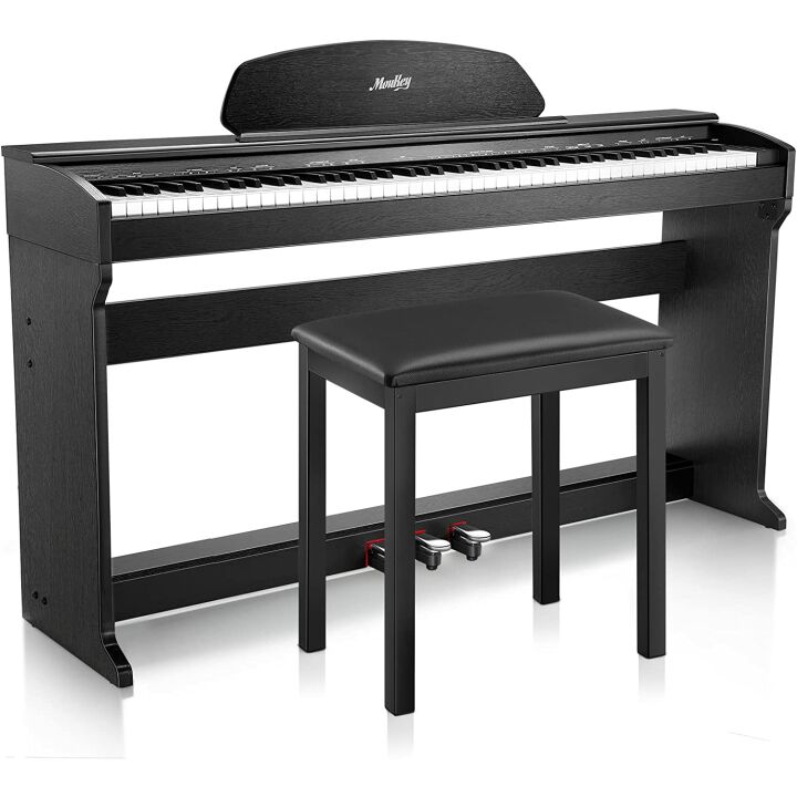 The Moukey MDP-350 comes equipped with a sturdy furniture stand and a comfortable piano stool, ensuring that you can play in style and comfort. The package also includes triple pedals and a power supply, providing you with everything you need to get started right out of the box. This keyboard’s design includes a foldable sheet music holder that conveniently tucks under the keyboard, creating a compact setup that’s easy to transport and store when not in use.