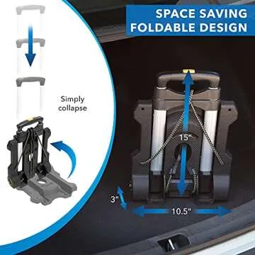Show moreIf you're navigating through busy airports or city streets, the Mount-It! Luggage Cart with Wheels is the ultimate travel companion you need. This innovative, foldable hand truck is designed for those who prioritize practicality while traveling. Measuring just 17.5” x 9” when folded, it conveniently stows away in your luggage or vehicle, making it an essential tool for anyone on the go. Weighing in at a mere 4 lbs, it is lightweight enough to carry easily, yet boasts a robust steel frame that can handle loads of up to 77 lbs. Whether you're hauling boxes, backpacks, or other gear, this cart ensures your belongings remain secure and safe on all of your travels.