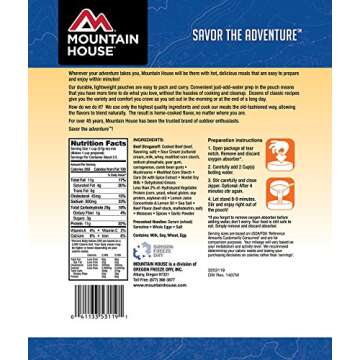 Show moreExperience the great outdoors with confidence and flavor with the Mountain House Beef Stroganoff with Noodles 6-Pack. Designed for all your adventures, whether it be camping, hiking, or emergency preparedness, each pouch offers a hearty and delicious meal that includes two and a half servings, perfect for sharing or fueling up after a long day on the trail. Crafted by the trusted brand Mountain House, known for its commitment to quality and taste, this meal retains its rich flavors and essential nutrients through a meticulous freeze-drying process. With just a bit of boiling water, you can have a hot meal ready in less than 10 minutes, allowing you to refocus on what you love: nature.