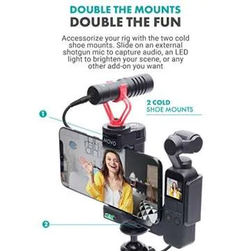 With a robust dual-screen setup, you can monitor your shots with your smartphone while using the Osmo Pocket for perfectly stabilized videos. One of the outstanding features of the Movo OPR-50 is the inclusion of two cold shoe mounts, which give you the ability to attach external accessories like microphones or LED lights. This versatility allows you to enhance your video production quality effortlessly.