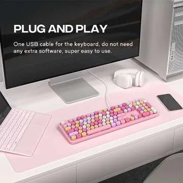 Show more Introducing the MOWUX Computer Keyboard Wired - your perfect blend of nostalgia and modern functionality! This Plug and Play USB Retro Round Typewriter Keyboard not only serves its essential purpose but also transforms your workspace with its vibrant and whimsical aesthetic. The beautifully crafted keyboard evokes memories of classic typewriters while incorporating cutting-edge technology to deliver a delightful typing experience. With its full-sized design adorned in a lovely pink color, every keystroke sounds and feels just right, making it a charming yet efficient addition to your desk.