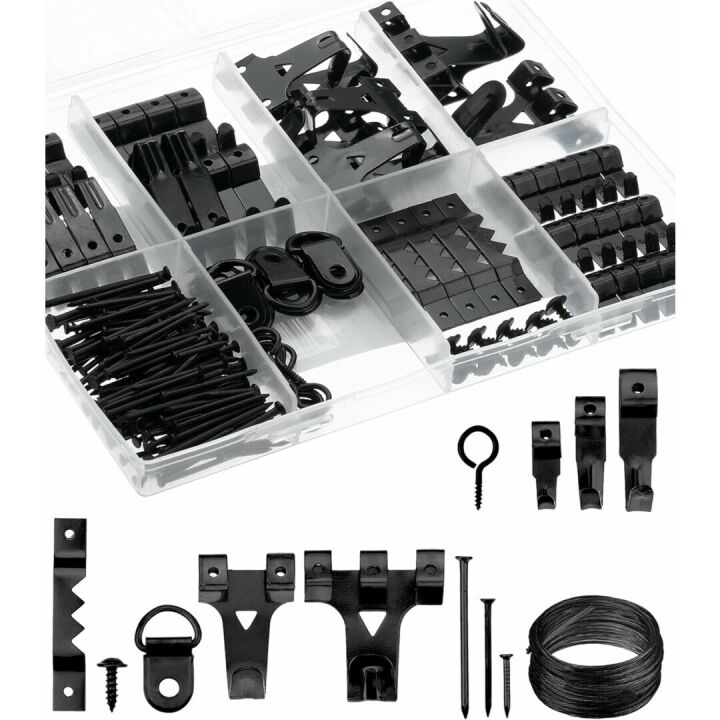 The kit includes picture hangers, nails, hooks, and frame hanging hardware.