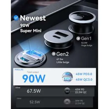 Show more Introducing the MRGLAS 90W Car Charger Adapter, your ultimate travel companion for fast and efficient charging on the go. This remarkable charger boasts SUPER FAST CHARGING capabilities, supporting PD 45W through its USB-C port and QC 45W via its USB-A port. With the ability to charge all your devices simultaneously, say goodbye to long wait times as it can boost your iPhone 16 Pro Max and Samsung Galaxy S25 from 0% to an impressive 89% in just 30 minutes!