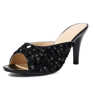MRKEWUNEY Heeled Mules in Black - Sparkle Sequins Slip-On Sandals for Her