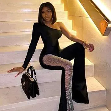 MRLION Sexy Mesh Patchwork One Shoulder Playsuits Women Elegant Skinny Flare Pants Jumpsuit Fashion Lady Party Streetwear,Black,S