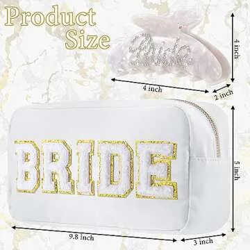 Show moreIntroduce the perfect gift for your beloved bride with this exquisite Bride Gift Set that features a stunning bride pouch and an elegant bride hair claw. Designed thoughtfully in elegant white, this gift set embodies the essence of bridal elegance while being both practical and aesthetically pleasing. The bride pouch boasts golden edged embellishments that add a touch of sophistication, while the hair claw is enhanced with dazzling rhinestones, making it the ideal set for a bride on her special day.