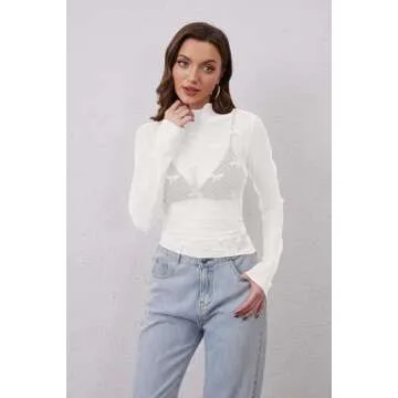 MSBESYOR Women Mesh Long Sleeve Top Sheer Lace Turtleneck Bow Embroidery Layering Shirts Sexy See Through Blouse White