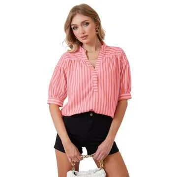 Show more Introducing a wardrobe essential that combines elegance and comfort, this women’s casual stripe blouse is crafted from super soft, cozy, breathable, and lightweight fabric. Designed for various occasions, its sexy v-neckline and 3/4 puff sleeves with pleated details create a stylishly professional look that is perfect for the office or a casual outing. The trendy color block striped print and oversized fit ensure you remain both fashionable and comfortable throughout your day.