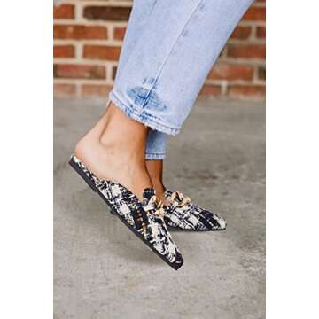 Show moreIntroducing the Mskilder Mules for Women—a stunning blend of style, comfort, and versatility that every modern woman needs in her wardrobe. These chic flat shoes feature a contemporary backless design, making them effortlessly easy to slip on and off, whether you're dressing for a casual day at home or heading out for a stylish evening. Crafted from high-quality synthetic leather, these mules are not only eco-friendly but also ensure a comfortable fit that lasts all day. The addition of a striking metal chain enhances their fashion appeal, ensuring you stand out wherever you go.