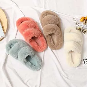 MSmofei Women's Fluffy furry fuzzy fur Slippers Soft Flat Sandals Slides Open Toe Cozy House Slippers Indoor Outdoor Anti-Slip Warm Comfy Slip On