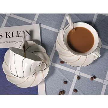 Show moreElevate your coffee experience with the MSYSGQI European Style Coffee Cups and Saucer Set. Crafted from high-quality bone china, these elegantly designed cups boast a capacity of 6.8 oz, making them perfect for serving cappuccinos or lattes with a sophisticated touch. The pristine white finish is complemented by luxurious gold trim, adding a hint of glamour to your daily coffee ritual. This delightful set of 2 is not only visually appealing but also practical, as it is lightweight yet durable, ensuring longevity for everyday use or special occasions.