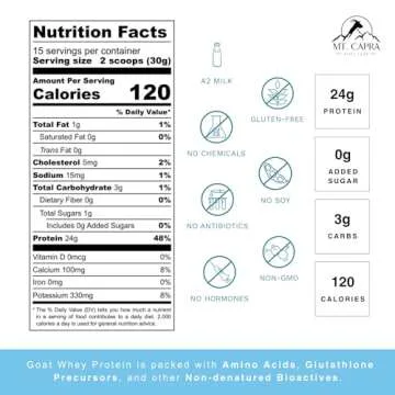 Mt. Capra Clean Whey Protein | Grass-Fed Undenatured Goat Whey Protein Powder | 24 g Protein Per Serving, All Natural, Non-GMO, High in Branch Chain Amino Acids | Unsweetened | 15 Servings - 16 oz