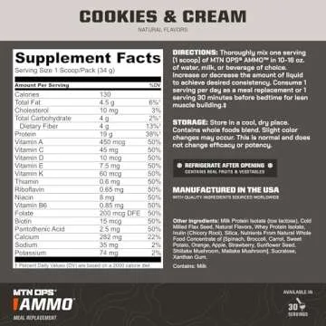 Show moreIntroducing the MTN OPS Ammo Protein Powder Meal Replacement Shake, the ultimate solution for anyone seeking a nutritious and delicious way to fuel their body. Designed meticulously with fitness enthusiasts in mind, this shake is more than just a protein supplement; it's a comprehensive meal replacement rich in nutrients that promote muscle building and overall well-being. With a tantalizing Cookies & Cream flavor and packed with 19g of protein, 10g of flaxseed, and a powerhouse blend of 4.5 servings of real fruits and vegetables, this shake is your key to achieving and sustaining your fitness goals.