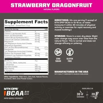 MTN OPS BCAA 2:1:1 Amino Acids Supplement Powder for Rapid Muscle Recovery & Repair with Zero Sugar & Gluten Free (30-Serving Tub, Strawberry Dragonfruit)