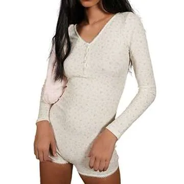Mtsebmves Women Y2k Long Sleeve One Piece Rompers Jumpsuit Floral Print Bodycon Bodysuit Shorts Pajama Onesie(A-White,S)