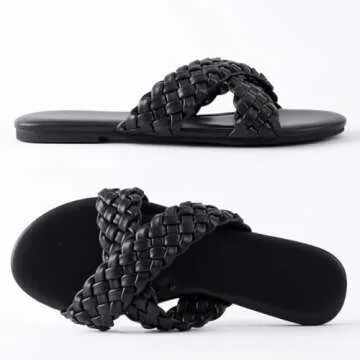 Mtzyoa Women Flat Sandals Black Size 7.5 Braided Crossover Summer Casual Sandalias para mujer Cute Leather Vacation Bohemian Dressy Slides