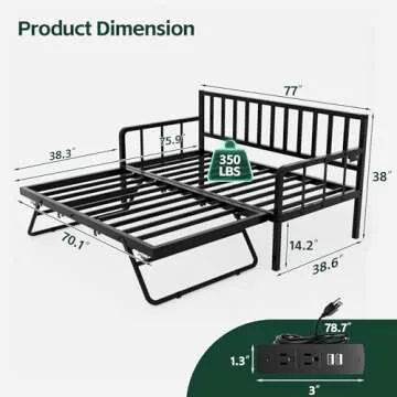MU Daybed with Trundle Bed, Metal Frame, Charging Station, LED Lights