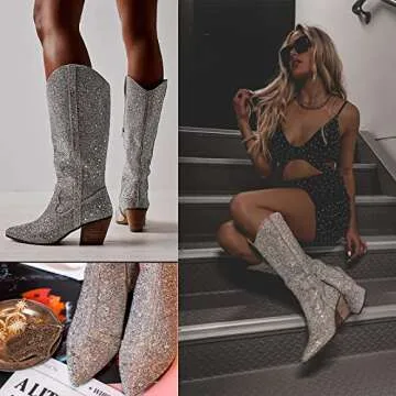 MUCCCUTE Women's Rhinestone Western Knee-High Boots Cowgirl Point-Toe Block Heel Wedding Party Boots for Ladies Size 7