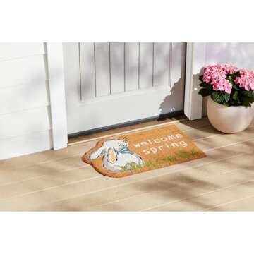 Show moreWelcome guests to your home with the charming and whimsical Mud Pie Bunny Coir Door Mat. This delightful welcome mat, measuring 17 3/4" x 29", is crafted from durable woven coir, ensuring it stands up to the elements while maintaining its vibrant design. The delightful bunny motif is not only adorable but also adds a playful and inviting touch to your entryway, making it the perfect companion for spring and beyond. With ample coverage, this mat prevents dirt and debris from being tracked into your home, enhancing your curb appeal and creating a warm ambiance for family and friends.