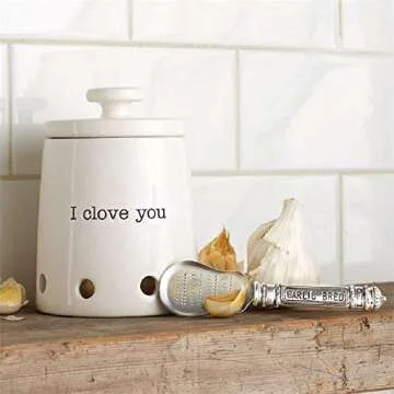 Show moreIntroducing the charming Ceramic Garlic Keeper, a must-have for every kitchen enthusiast! Crafted with care, this beautiful white ceramic keeper stands at a height of 4 inches and features a diameter of 3.5 inches, making it a perfect fit for your countertop. Completing the package is a stunning silverplate grating spoon measuring 4.5 inches, ideal for effortlessly grating garlic.