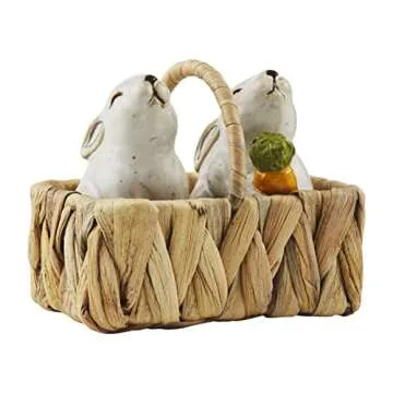 Show moreIntroduce a touch of whimsy to your springtime gatherings with the Mud Pie Easter Bunny Salt and Pepper Shaker Set. This delightful 3-piece set features beautifully hand-painted speckle stoneware bunny shakers, expertly crafted to bring joy to your dining table. The set is not only functional but also decorative, resting elegantly in a charming water hyacinth basket that adds a natural, seasonal flair.