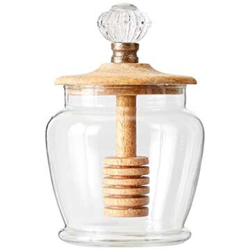 This Door Knob Glass honey jar is a timeless addition to your kitchen. The honey glass jar that includes a mango wood dipper lid that has a glass door knob handle. The honey jar measures 5" x 3 1/4" dia. The honey jar is made of glass, and is recommended to be cleaned by wiping clean with a damp cloth.