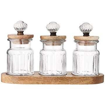 Mud Pie Knob Glass Condiment Set, canister 3 3/4" x 2 3/4" dia | caddy 3 3/4" x 10 1/4", Brown