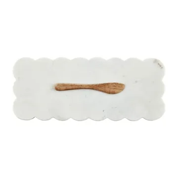 Show moreIntroducing the Mud Pie Scallop Marble Board Set, an exquisite blend of style and functionality for your kitchen. This two-piece set features a beautifully crafted white marble board with an elegant scalloped edge, designed to impress your guests and elevate your dining experience. Accompanying the board is a charming mango wood spreader, perfectly sized at 5 ½" to enhance your serving options. Whether you are hosting a lavish dinner party or enjoying a cozy family gathering, this set serves as a stunning centerpiece that brings sophistication to any table setting.