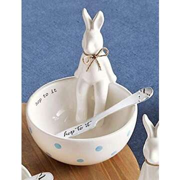 Delight in the whimsical charm of this enchanting 2-piece set, featuring a beautiful ceramic dip cup ideal for your next gathering. The cup showcases a figural bunny perched playfully on the rim, adding a touch of joy to your dining experience. Hand-painted with vibrant patterns, this eye-catching piece is sure to be a conversation starter at any table.