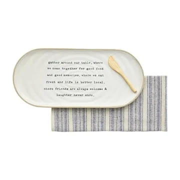 Show moreDiscover the Mud Pie Stoneware Hostess Set, a 3-piece ensemble that brings elegance and functionality to your entertaining needs. This set features a natural stoneware tray, a soft cotton towel, and a durable wood spreader, perfect for serving cheeses, appetizers, or desserts. The stoneware tray is both dishwasher and microwave safe, offering convenience alongside its stylish design. The cotton towel adds a touch of softness and absorbency, while the wood spreader is ideal for serving. Whether it's a formal dinner party or a casual gathering, this hostess set is designed to impress.