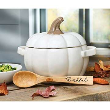 Show moreElevate your holiday gatherings and culinary creations with the charming Mud Pie Thanksgiving Pumpkin Baking Spoon Covered Dish Set. This delightful 3-piece set showcases a beautifully crafted ceramic pumpkin-shaped baking dish adorned with intricate details, including a removable lid shaped like a pumpkin stem and convenient side handles for easy transport. Perfectly designed for both functionality and aesthetics, this baking dish adds a festive touch to your Thanksgiving table and is sure to be a conversation starter during family gatherings. The set comes beautifully tied with a wooden spoon inscribed with the word "thankful," encapsulating the spirit of the season, making it a fantastic gift for the hosts and hostesses in your life.