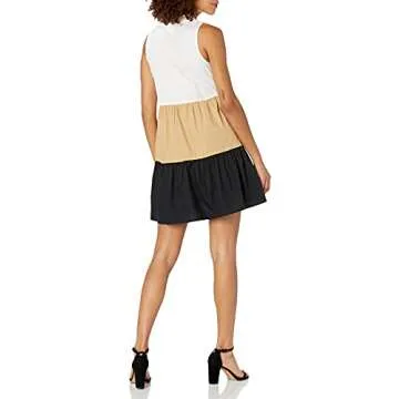 Sleeveless cotton poplin dress features tiered color-block panels and ruffle V-neck with tassel ties. Measures approximately 35" from shoulder to hem on size small. Care Instructions: DRY CLEAN ONLY Model is 5'7" and is wearing a small.