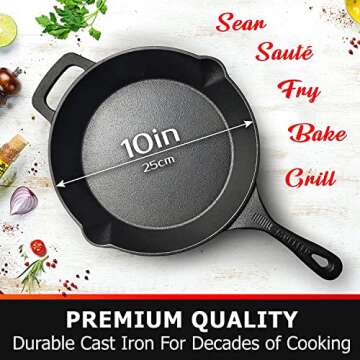 Show more Discover the culinary magic of the Mueller Heavy-Duty Cast Iron Skillet, your new kitchen companion crafted for both versatility and durability. This 10-inch pre-seasoned pan is an essential tool for anyone who loves to cook, whether you're a seasoned chef or a passionate home cook. Designed from premium, heavy-duty cast iron, this skillet ensures impressive heat distribution and retention, allowing you to achieve the perfect sear every single time. It's not just a frying pan; it's a culinary powerhouse that brings a touch of rustic charm to your kitchen.
