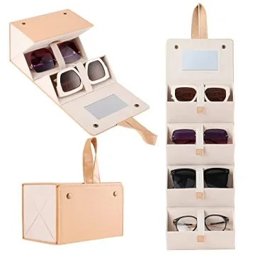 Muf Travel Sunglass Organizer - Elegant 4-Slot Leather Case for Sunglasses with Mirror & Strap